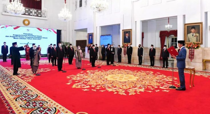 Jakarta – Presiden Joko Widodo melantik dan mengambil sumpah jabatan anggota Komisi Pemilihan Umum (KPU) dan Badan Pengawas Pemilihan Umum (Bawaslu) masa jabatan tahun 2022-2027. Acara pelantikan berlangsung di Istana Negara, Jakarta, pada Selasa, 12 April 2022 dengan menerapkan protokol kesehatan ketat.