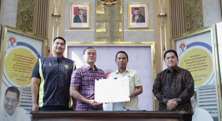 Jakarta – Menteri Pemuda dan Olahraga Republik Indonesia (Menpora RI) Dito Ariotedjo bersama Ketua Umum PSSI Erick Thohir menyaksikan penandatanganan perjanjian kerja sama bantuan pemerintah untuk pemusatan latihan nasional Timnas Indonesia U-17 dan penyelenggaraan Piala Dunia U-17 2023.