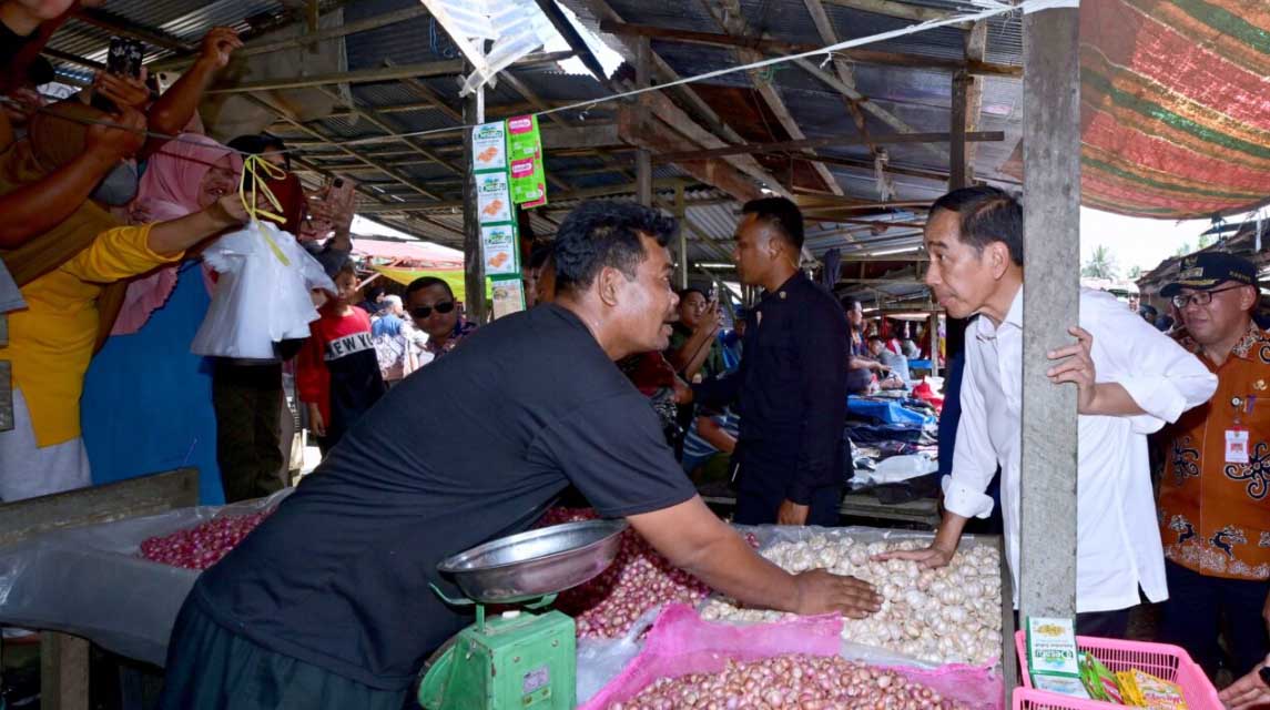 Dalam kunjungannya ke Pasar Waru, tampak Presiden turut menyapa pedagang seraya membagikan sejumlah bantuan berupa sembako.