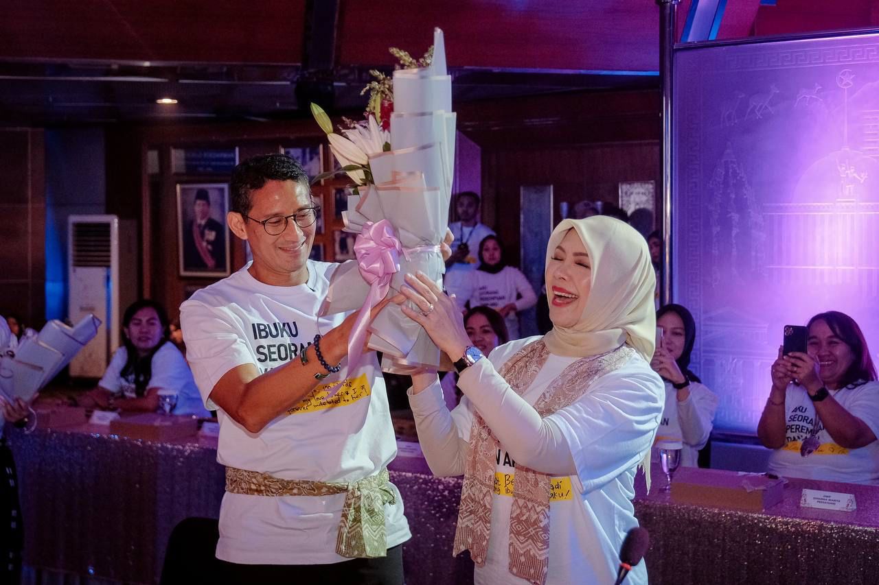 Pada kesempatan ini, Menparekraf Sandiaga didampingi istri, Nur Asia Uno, yang juga memberikan pesan khusus kepada perempuan di Indonesia.
