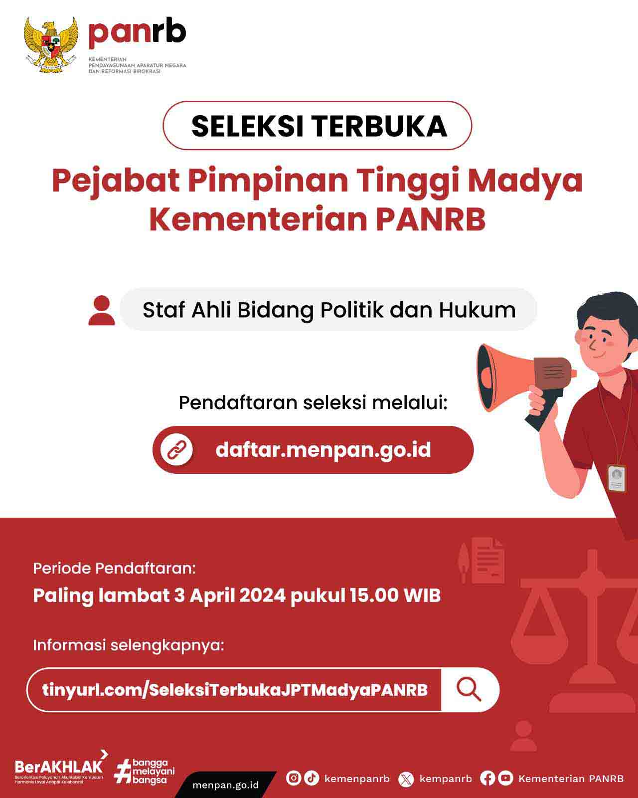 Adapun jabatan yang sedang dilelang dalam kesempatan ini adalah jabatan Staf Ahli Menteri PANRB Bidang Politik dan Hukum. Kesempatan ini terbuka bagi para pegawai negeri sipil (PNS) yang berminat dan memenuhi persyaratan.
