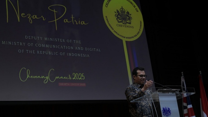 Nezar Patria, yang juga alumni Chevening, menyampaikan kebanggaan saat melepas penerima beasiswa Chevening-Komdigi yang akan melanjutkan studi ke Inggris pada September mendatang.