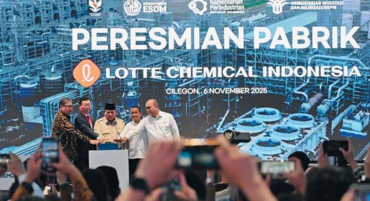 Banten – Presiden Prabowo Subianto meresmikan pabrik Lotte Chemical Indonesia (LCI) di Kota Cilegon, Provinsi Banten, Kamis, 6 November 2025. Acara peresmian ini menandai beroperasinya salah satu proyek industri petrokimia yang menjadi tonggak penting dari upaya pemerintah memperkuat hilirisasi industri nasional.